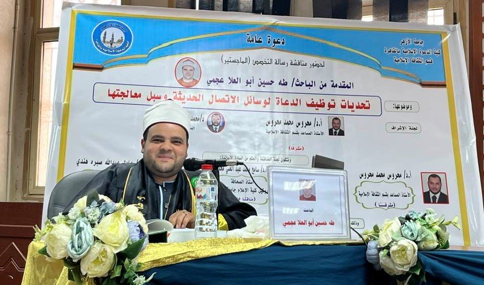 منحت كلية الدعوة الإسلامية بالقاهرة – جامعة الأزهر، اليوم الثلاثاء 30 سبتمبر 2025م، الباحث طه حسين أبو العلا عجمي درجة الماجستير في الثقافة الإسلامية (شعبة الثقافة الإسلامية) بتقدير ممتاز، وذلك عن رسالته التي جاءت بعنوان: “تحديات توظيف الدعاة لوسائل الاتصال الحديثة وسبل معالجتها”.