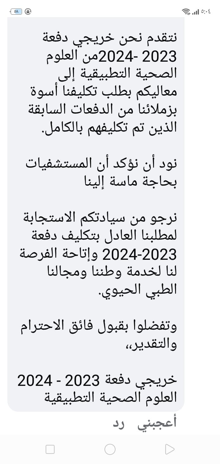 نرجو من سيادتكم الاستجابة لمطلبنا العادل بتكليف دفعة 2023-2024 وإتاحة الفرصة لنا لخدمة وطننا ومجالنا الطبي الحيوي.