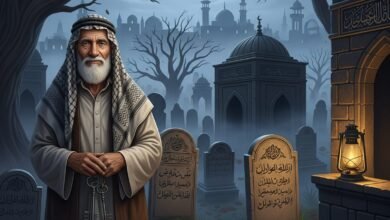 وقفَ عادلٌ يلهثُ، وفي اللحظةِ التي كادَ يقعُ فيها من الرعبِ، لمحَ شيئاً يلمعُ على شاهدِ القبرِ. كانتْ قطعةً ذهبيةً صغيرةً موضوعةً بجانبِ اسمِ “سليم” وكأنَّها هديةٌ منهُ. أخذَها ووضعَها في جيبهِ، ثمَّ مضى إلى غرفتِهِ الصغيرةِ، ليعيشَ لحظاتٍ من الخوفِ والدهشةِ، وهوَ يحاولُ استيعابَ ما رأى وسمعَ تلكَ الليلة…