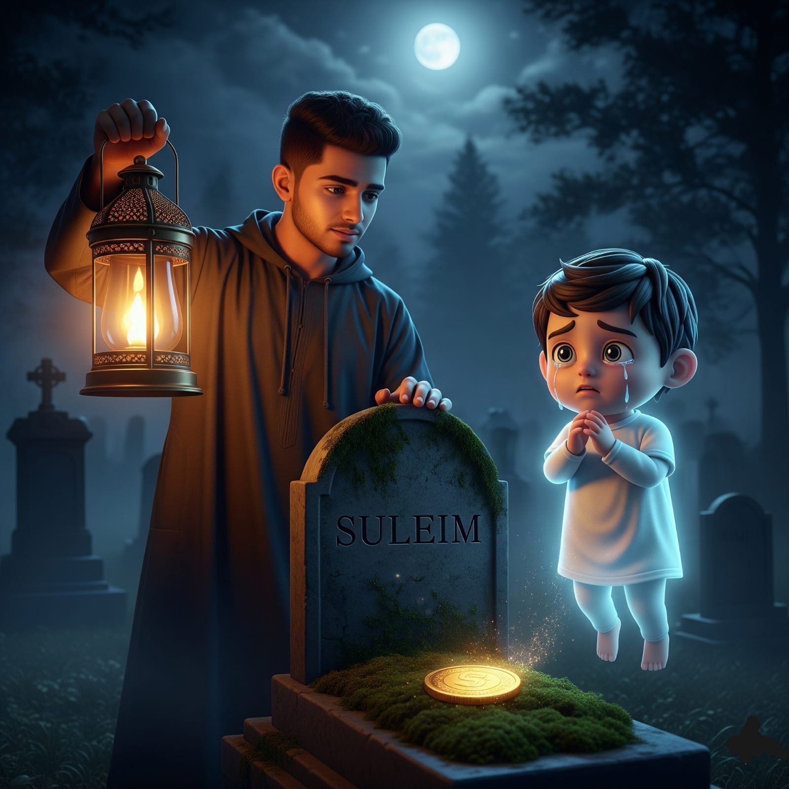 نظرَ عادلٌ إلى شاهدِ القبرِ، ووجدَ اسمَ “سليم” منحوتاً عليهِ. لمْ تعدْ قدماهُ تحملانِهِ، وبدأَ يزحفُ هارباً من الرعبِ، لكنَّ الطفلَ ظهرَ أمامهُ فجأةً. قالَ لهُ الصغيرُ بابتسامةٍ حزينةٍ: “لا تخفْ يا عادل، لقدْ أخبرني والدُكَ عنكَ، وقالَ لي إنكَ ستكونُ صديقي الجديد.”