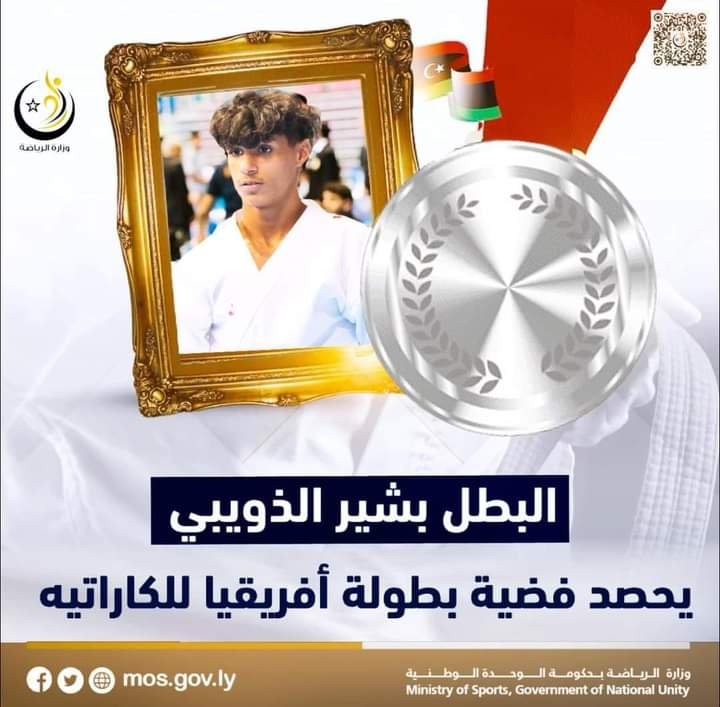 تتواصل حصد القلائد للاتحاد الليبي الكاراتيه بمشاركته ببطولة أفريقيا المقامة بدولة تونس ، حيث تحصل الرياضي بشير الذويبي على القلادة الفضية في بطولة أفريقيا للكاراتيه المقامة بتونس كومتي وزن تحت 68 كجم لفئة الشباب