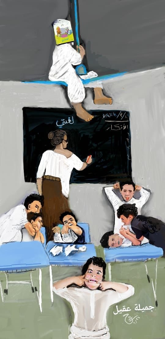 تركتهما يتحدثان ورفعت رأسي لأرى ما يحدث في بقيّة الفصل الذي يعُج بالفوضى من بقايا الطعام وقناني المياه والعصير والمناديل المتناثرة على الأرض وفوق الطاولات المختلطة بالأدوات المدرسيّة والكتب..