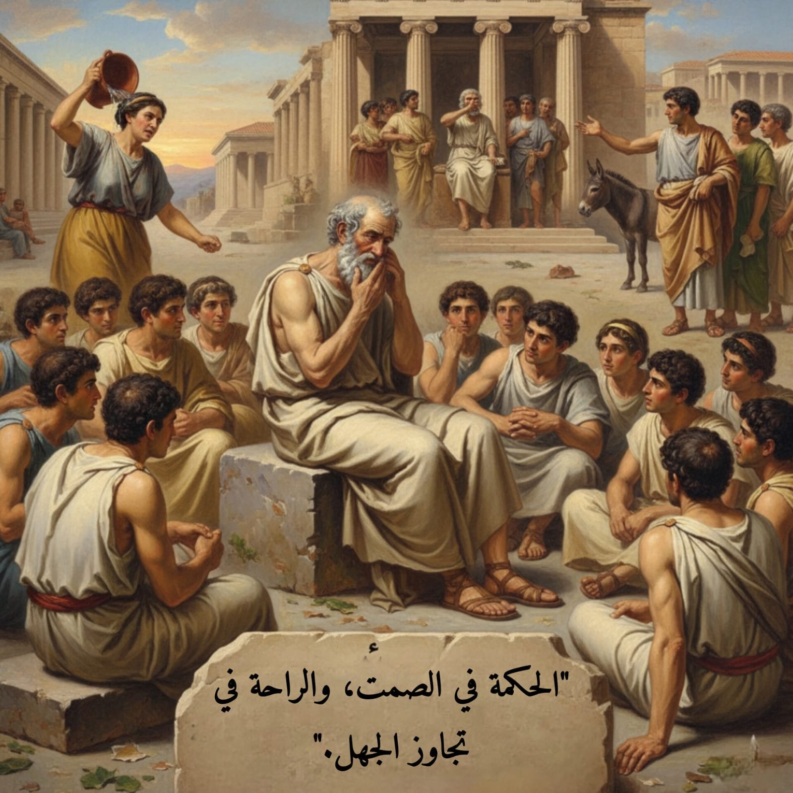 واصلَ سقراطُ حياتَهُ بهدوءٍ، متذكّراً أنَّ الحكمةَ تكمنُ في الصمتِ، وأنَّ راحةَ البالِ لا تُقدَّرُ بثمنٍ. لقدْ علّمَنا أنَّ الصراخَ والغضبَ لا يحلانِ المشكلاتِ، بلْ إنَّ الصمتَ قدْ يكونُ أقوى ردٍّ، وأفضلَ طريقٍ للسلامِ الداخليِّ.