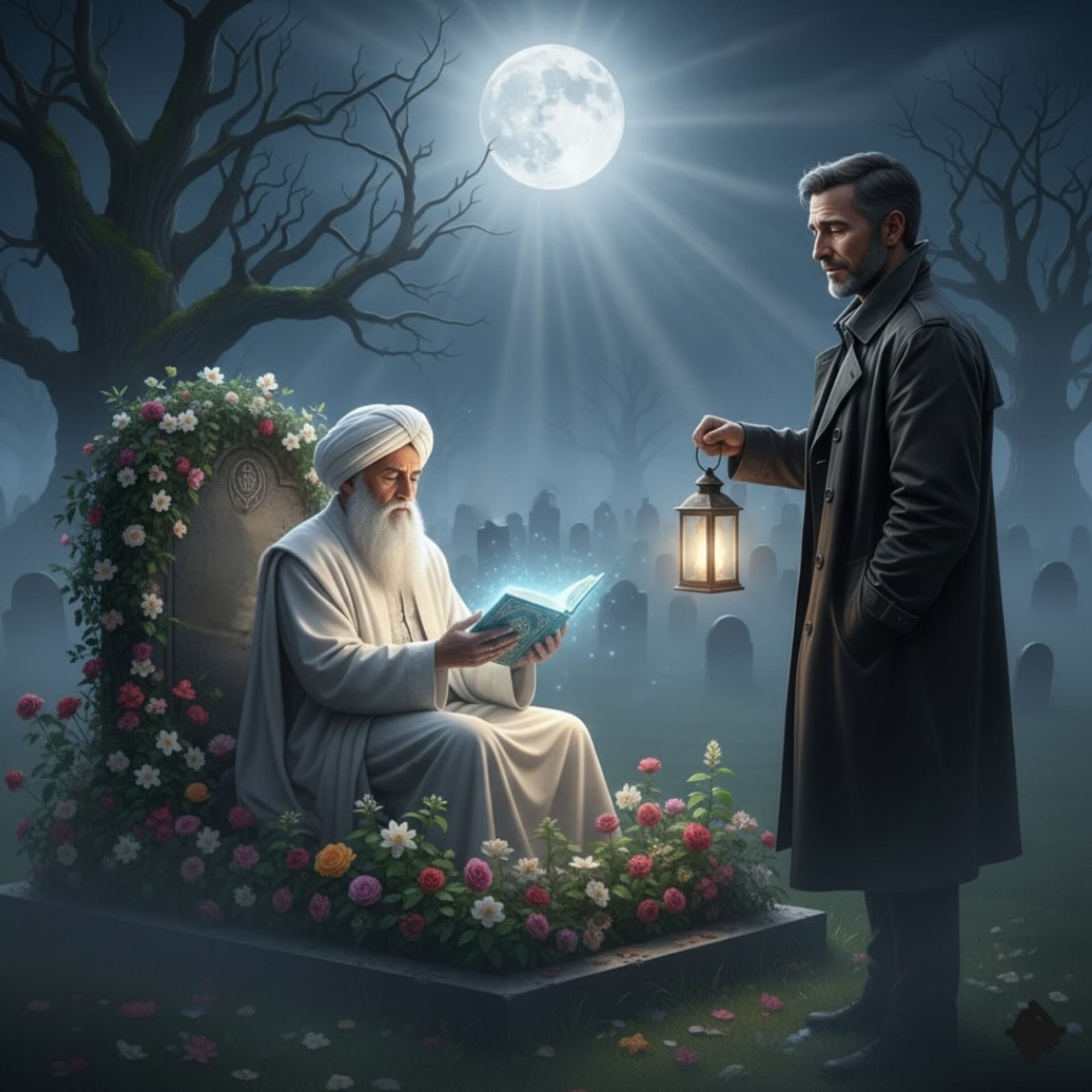 خرجَ عادلٌ منْ غرفتِهِ حاملاً مصباحَهُ، يتتبعُ الصوتَ، إلى أنْ وصلَ إلى قبرٍ تحيطُ بهِ أشجارٌ وأزهارٌ جميلةٌ. كانَ هناكَ رجلٌ ذو هيبةٍ ووقارٍ، ولحيةٍ بيضاءَ كثيفةٍ، يلبسُ عمامةً وعباءةً بيضاءَ. كانتِ السكينةُ والهدوءُ تكسوهُ. لمْ يقاطعْهُ عادلٌ، بلْ جلسَ يستمعُ بخشوعٍ حتى انتهى الرجلُ منْ قراءتِهِ.