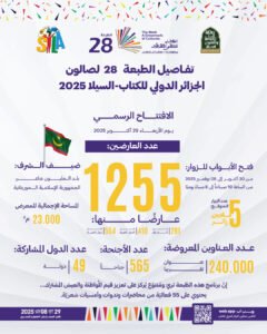 وكانت الطبعة الـ 28 لصالون الجزائر الدولي للكتاب, المنظمة تحت الرعاية السامية لرئيس الجمهورية, السيد عبد المجيد تبون, قد نظمت تحت شعار “الكتاب ملتقى الثقافات” بمشاركة 1254 دار نشر من 49 دولة, بينها موريتانيا ضيف الشرف.