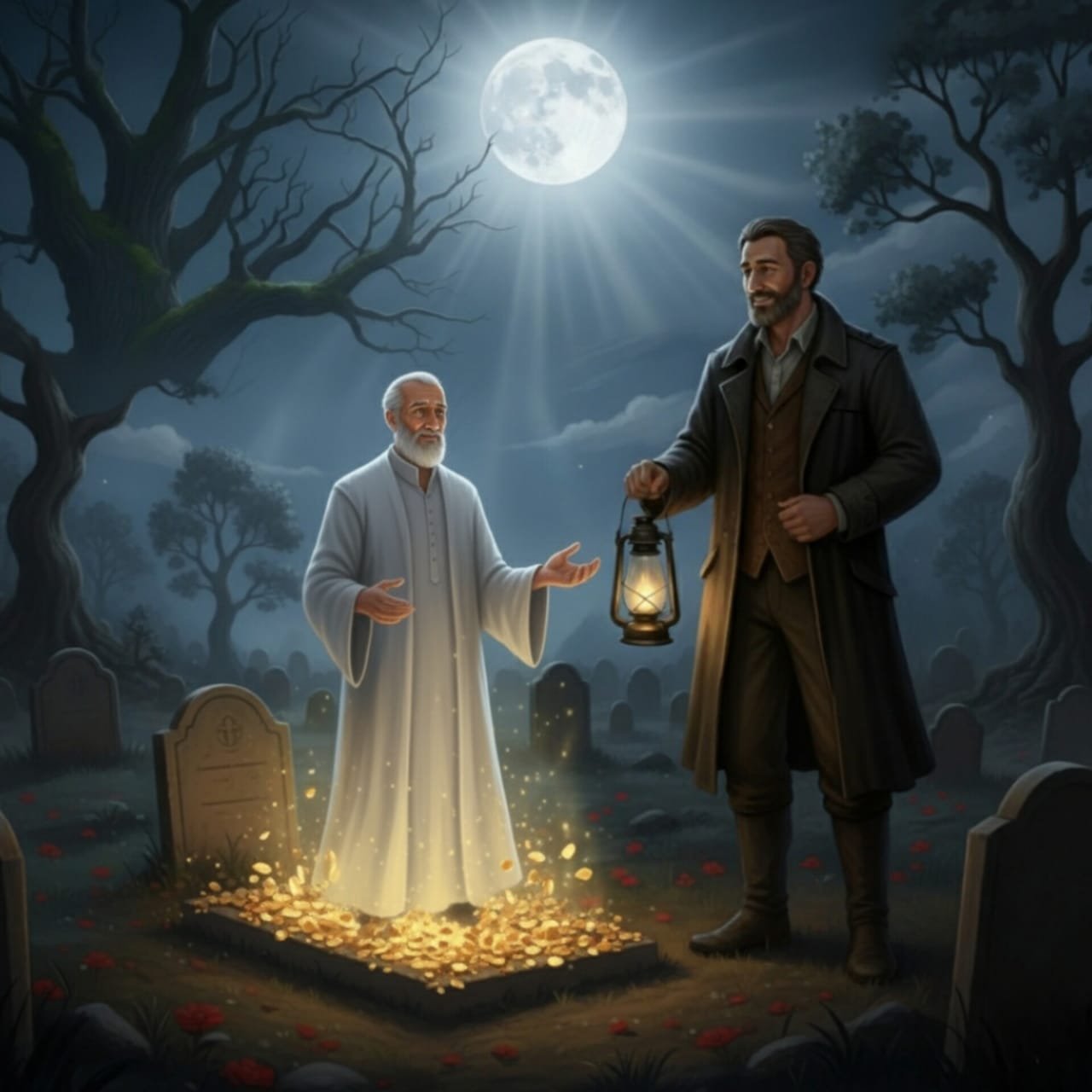 اختفتِ الروحُ في نورِ السلامِ، وما إنْ خفتَ نورُها، لمعَ نورٌ جديدٌ لقطعٍ ذهبيةٍ كثيرةٍ على ضريحِ أبي خالدٍ، وكأنها هديةٌ منهُ على ما قدّمَ منْ خيرٍ وعطاءٍ. وبقيَ عادلٌ واجماً. لمْ يكنْ يطلبُ كنوزاً، لكنَّهُ أدركَ أنَّ هذا الكنزَ هوَ رسالةٌ منَ السماءِ، رسالةٌ تُؤكّدُ أنَّ قيمةَ الإنسانِ الحقيقيةِ تُقاسُ بأمانتِهِ وإحسانِهِ في السرِّ.