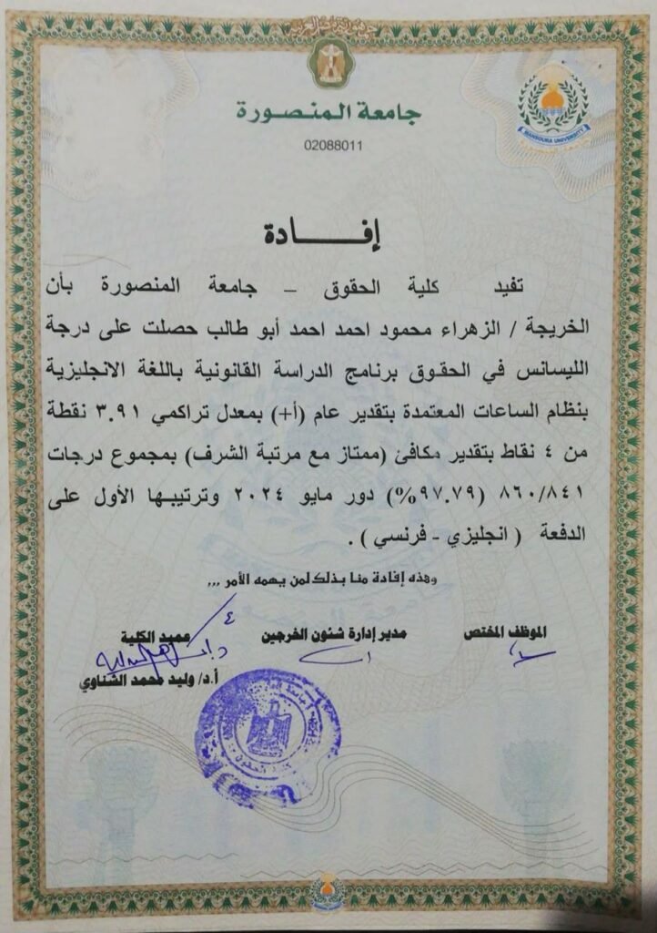 تناقلت صفحات السوشيال ميديا خبر تعيين الزهراء أبو طالب الأولى حقوق المنصورة معيدة، بعد حل أزمة التعيين التي شهدت مشاركات عبر السوشيال ميديا كونها الأولى على حقوق لغة انجليزية بتقدير ممتاز مرتبة شرف.