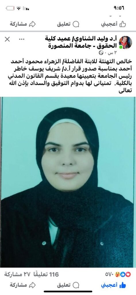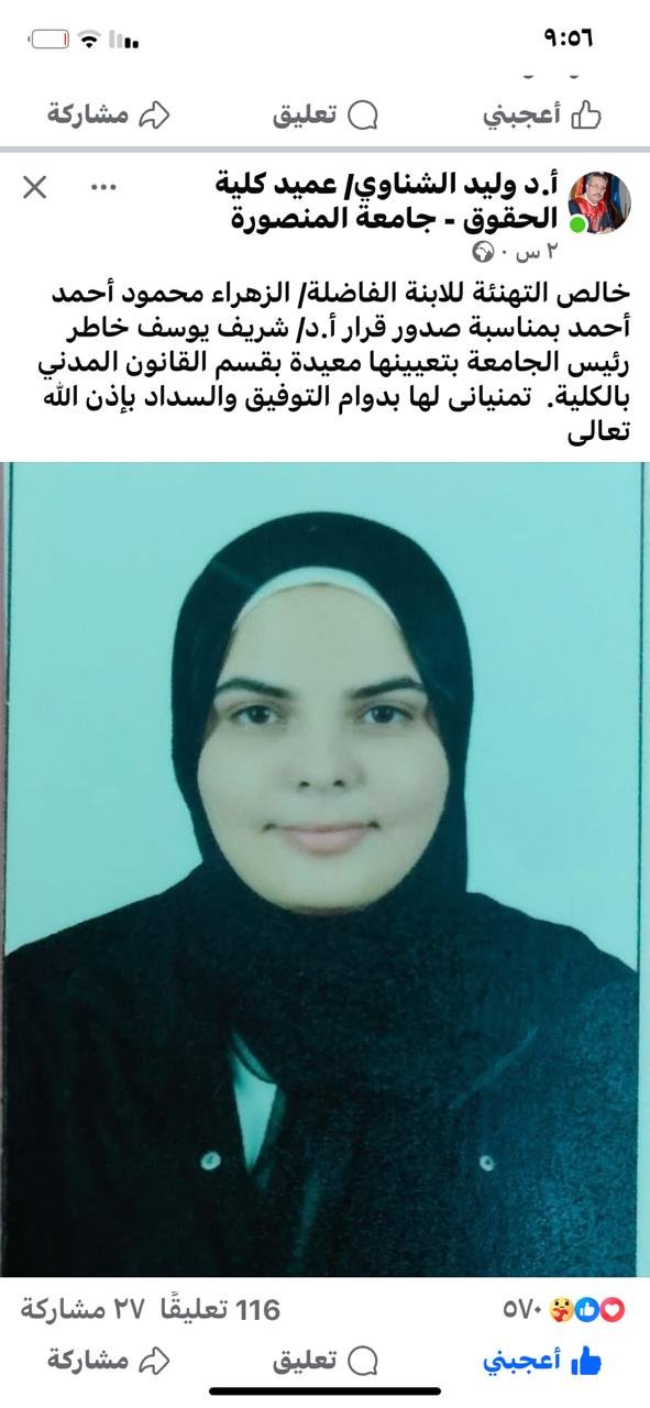 صفحات الدقهلية تتناقل خبر تعيين الزهراء أبو طالب معيدة وانتهاء أزمة الأولى حقوق المنصورة