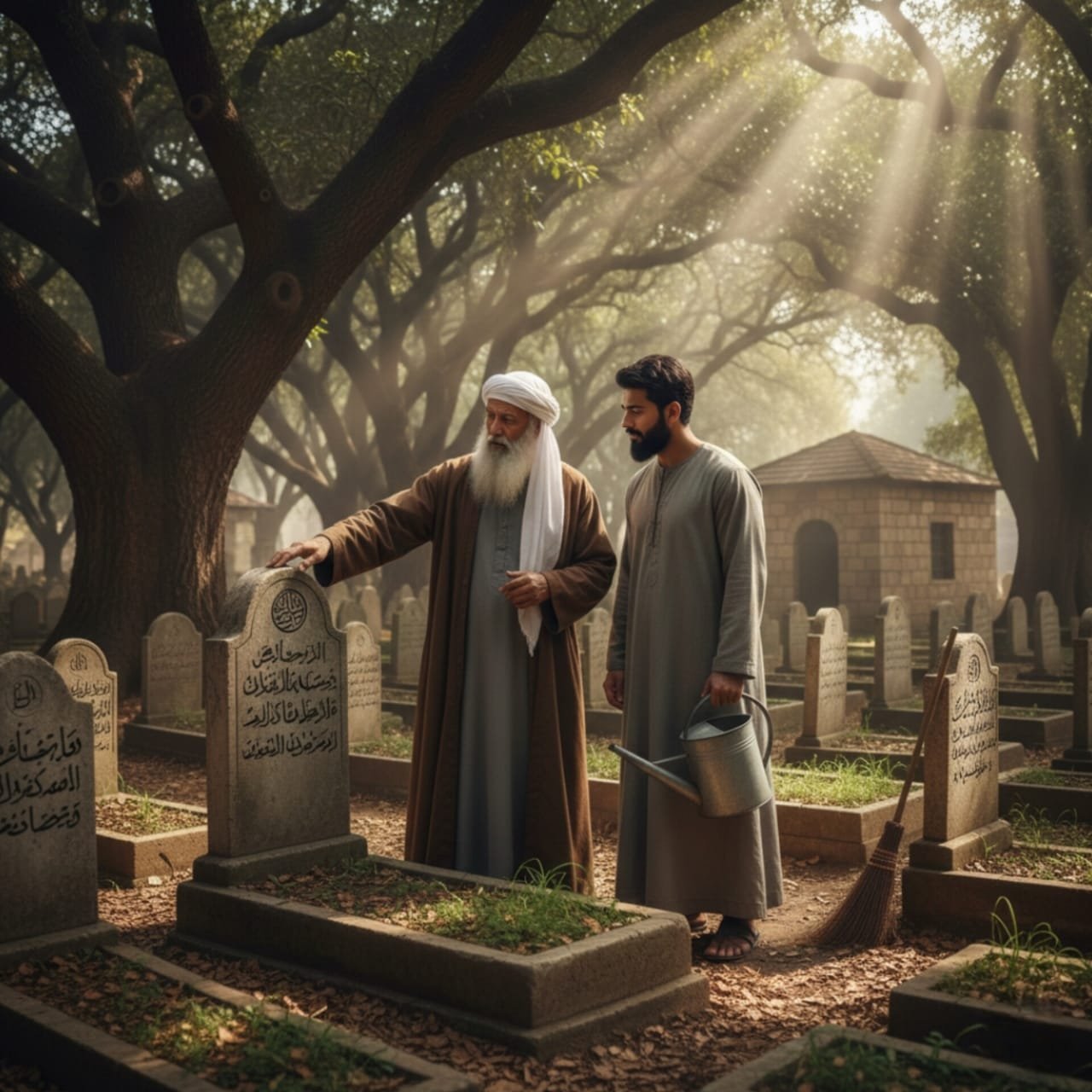 ”يا عبدَاللهِ، لقدْ حملتُ هذهِ الأمانةَ عنْ أبي، والآنَ أُسلّمُها إليكَ. تذكّرْ أنَّ هذهِ المقبرةَ ليستْ مكاناً للموتِ، بلْ هيَ مدرسةٌ لِلأحياءِ. لقدْ علَّمتْنيَ هذهِ الأرواحُ أنَّ كلمةَ حقٍّ تُقالُ هيَ كنزٌ لا يفنى، وأنَّ الرحمةَ تُخفّفُ العذابَ، وأنَّ السماحَ هوَ آخرُ أبوابِ النجاةِ. لا تخفْ منْ أرواحِ الأمواتِ، بلْ خَفْ منْ غفلةِ الأحياءِ.”