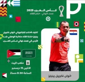 فيفا كلّف الحكم الباراغواياني خوان غابرييل بينيتيز، لإدارة المباراة بين المنتخبين السعودي والأردني.