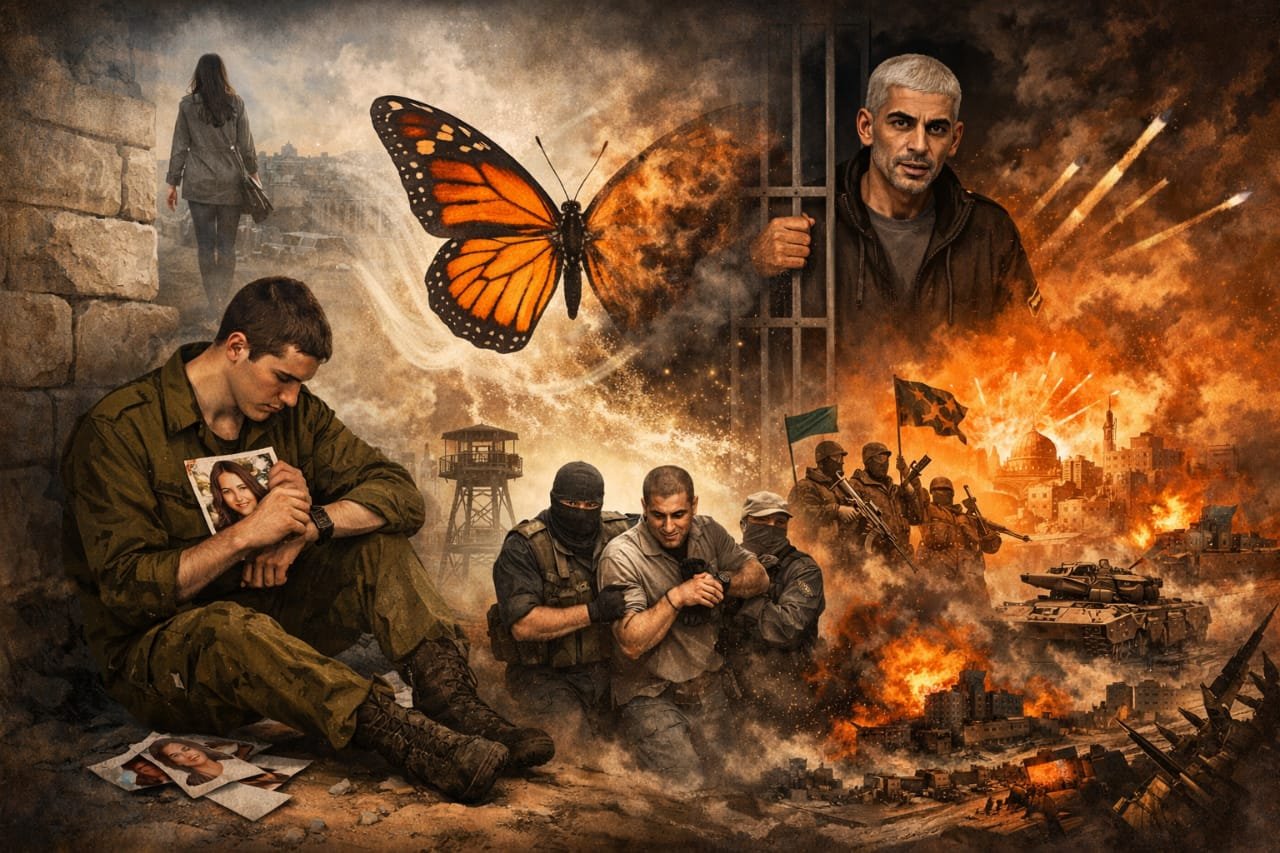 ​في يونيو ٢٠٠٦، وعلى حدود غزة المثقلة بالبارود، وقع الشاب أسيراً في قبضة حركة حماس. ومن هنا، بدأت الفراشة تحرك جناحيها بقوة أكبر. سنوات من الاحتجاز انتهت بصفقة كبرى عام ٢٠١١، صُفدت فيها الأغلال عن يدي رجل يدعى “يحيى السنوار”.