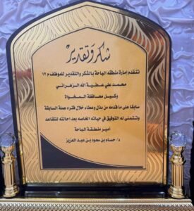ويأتي هذا التكريم عرفاناً بما قدمه الأستاذ محمد علي الزهراني من جهود مخلصة وأعمال متميزة أسهمت في خدمة الوطن والمواطن، وكان لها أثر إيجابي في تطوير العمل الإداري وتعزيز مستوى الأداء خلال فترة عمله.