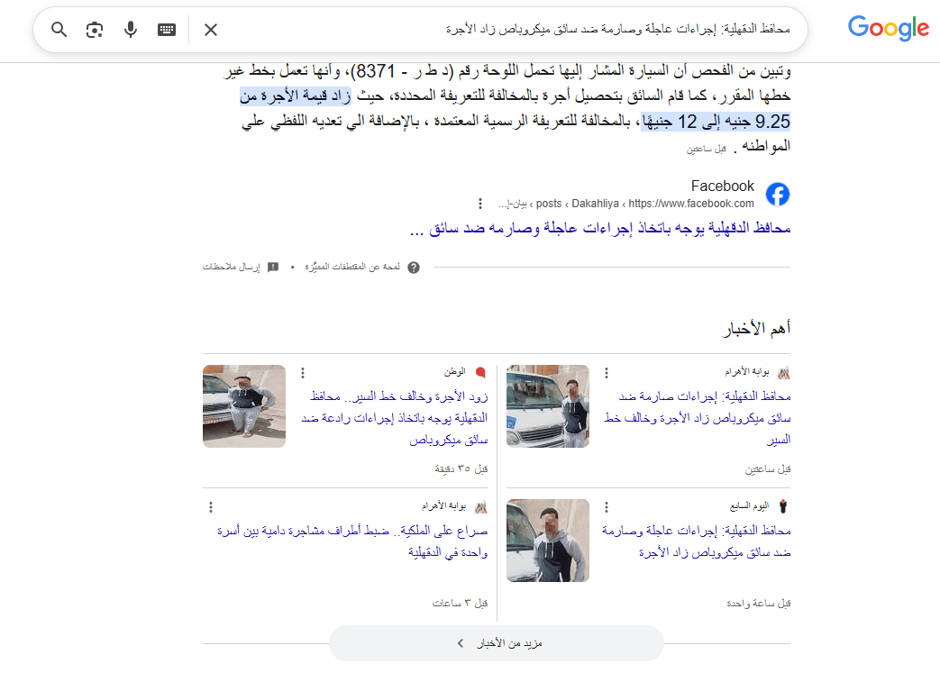 – محافظ الدقهلية يوجه باتخاذ إجراءات عاجلة وصارمه ضد سائق ميكروباص زاد الأجرة وخالف خط السير .– مرزوق: لن نسمح بأي استغلال للمواطنين أو مخالفة للتعريفة وخطوط السير .