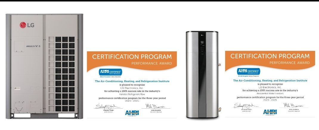 • نالت شركة «إل جي إلكترونيكس» جائزة أداء معهد تكييف الهواء والتدفئة والتبريد (AHRI Performance Award) عن مجموعة من منتجات التدفئة والتهوية وتكييف الهواء، بما يشمل أنظمة التدفق المتغير (VRF)، ووحدات التبريد (Chillers)، وسخانات المياه المنزلية.