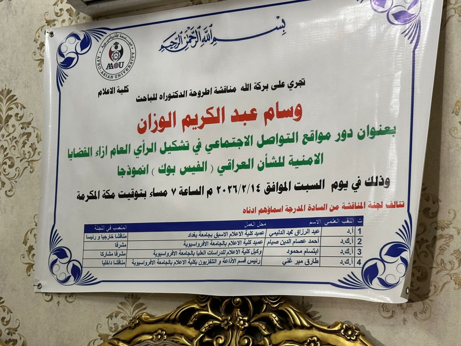 حصل الدكتور وسام الوزان اليوم السبت ٢٠٢٦-٢-١٤ على شهادة الدكتوراه في الاعلام من كلية الاعلام في الجامعة الافرواسيوية وبتقدير امتياز مع مرتبة الشرف مع التوصية بطبع الاطروحة على نفقة الجامعة.